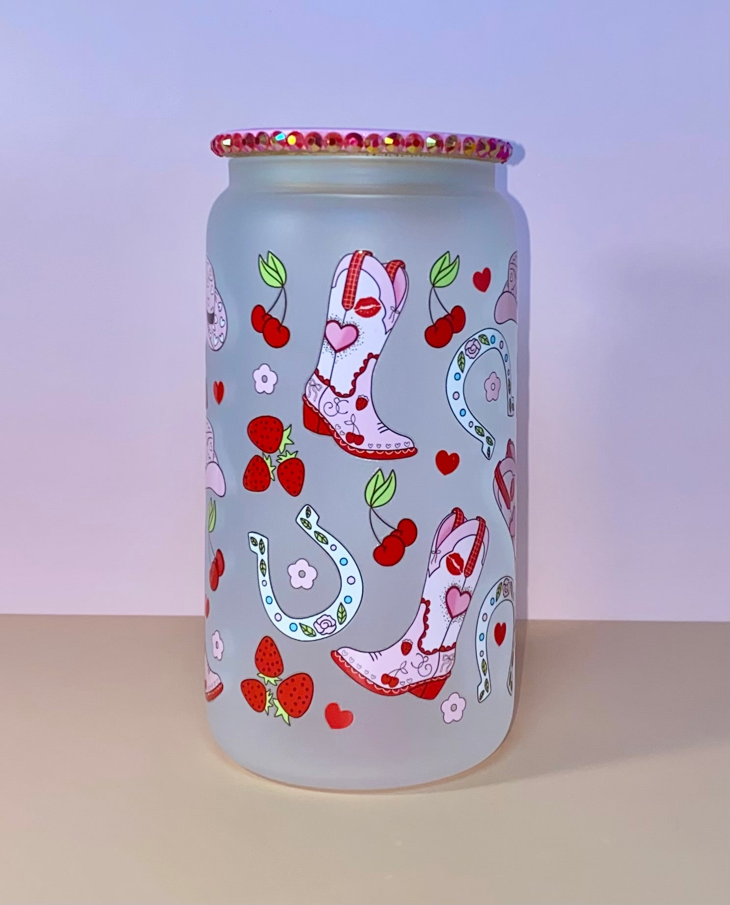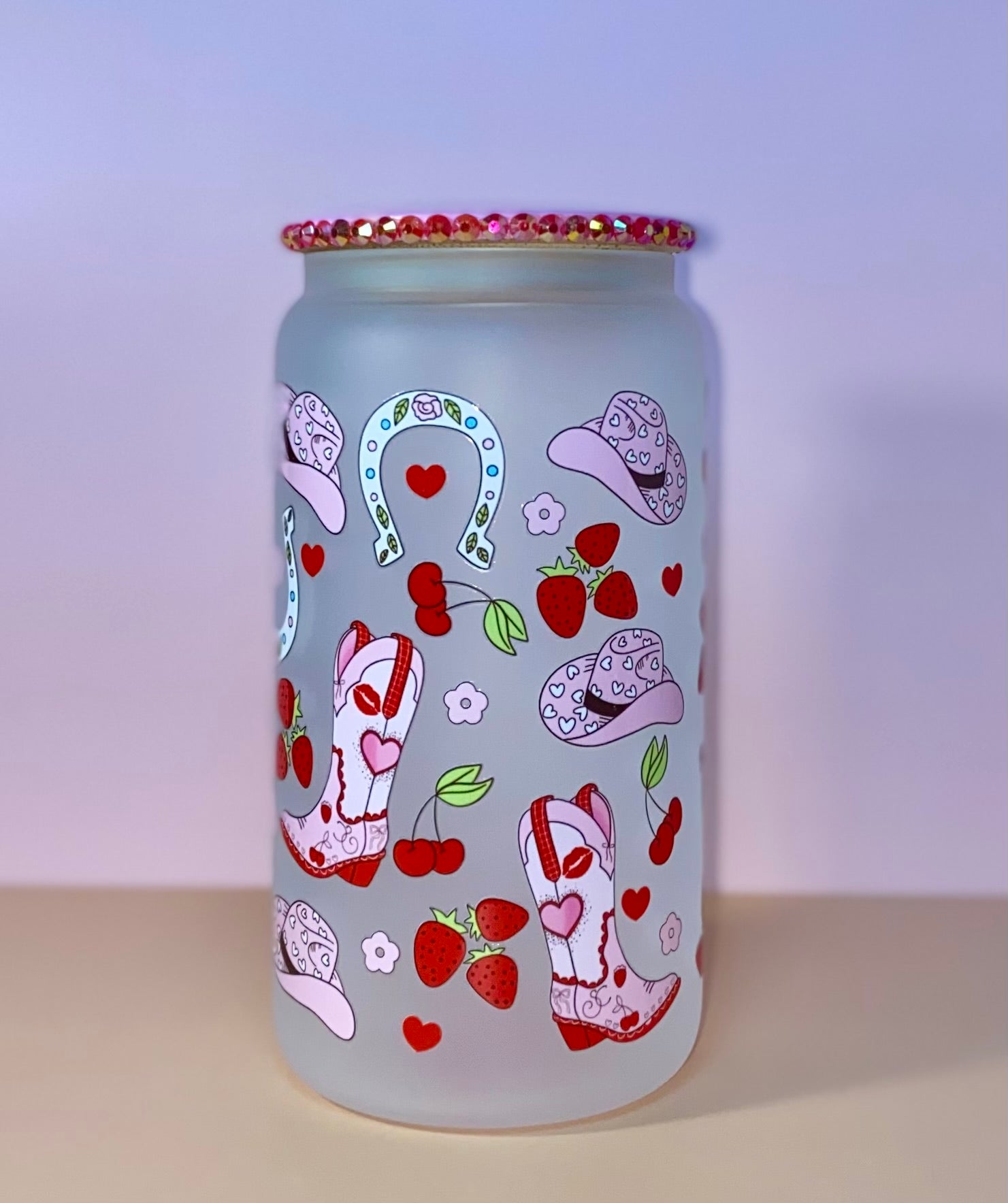 Sip in style with this cowgirl-inspired glass cup featuring a 16oz capacity. Perfect for enjoying your favorite beverage while embracing your inner wild west. (Yeehaw not included)