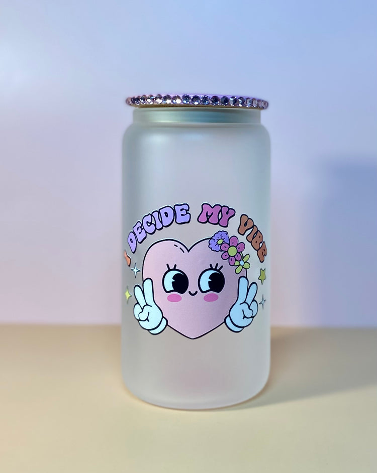 Elevate your beverage experience with the I Decide My Vibe Glass Cup. This 16oz cup is the perfect size for your favorite drink. Crafted with quality glass, it offers a sleek and durable design for everyday use. Make a statement and choose your own vibe with this must-have cup.