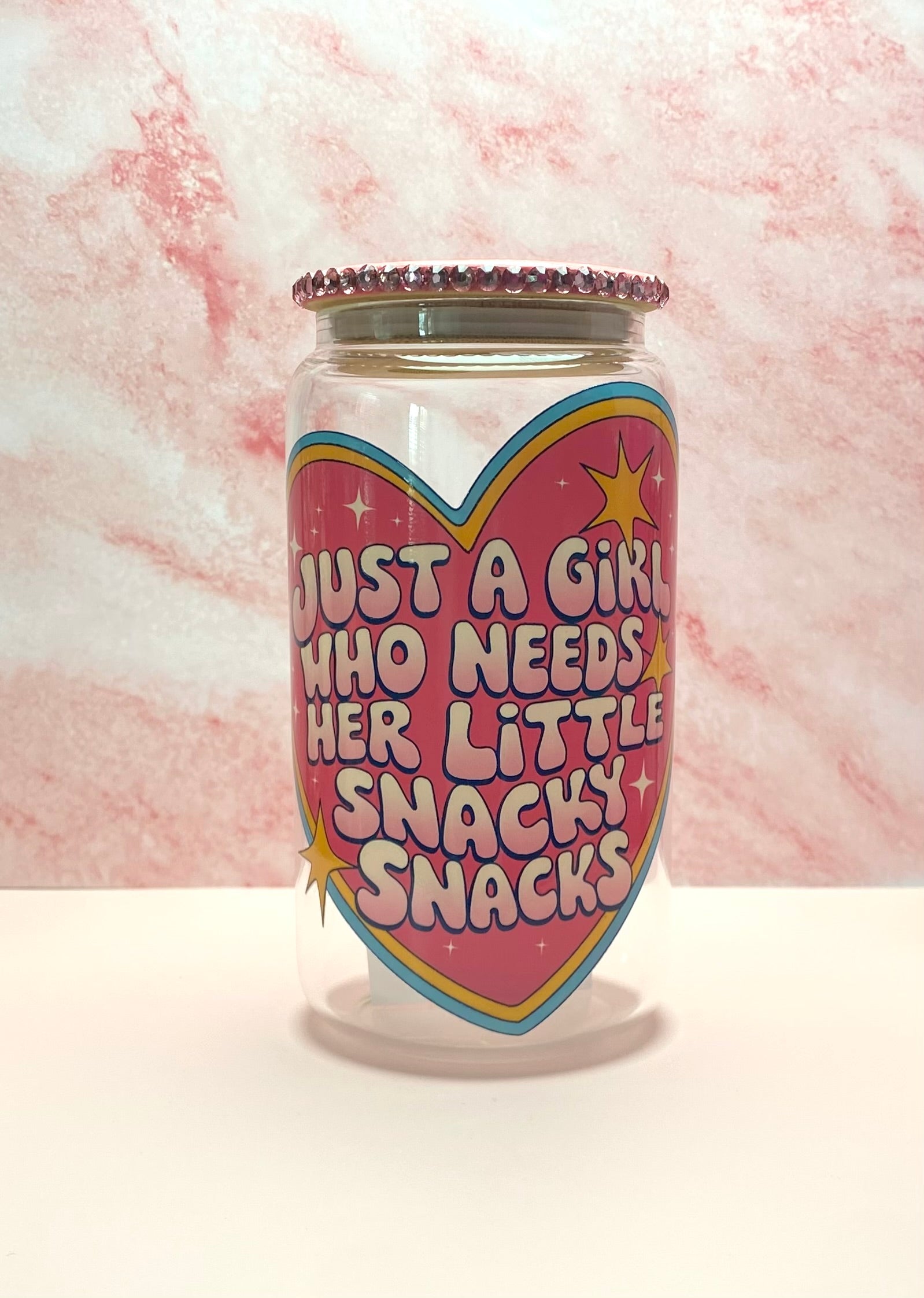 Quench your thirst with our 16oz Just Girl Who Needs Her Little Snacky Snacks Glass Cup. Perfect for holding your favorite drinks on-the-go. Don't underestimate the importance of a good snack break!