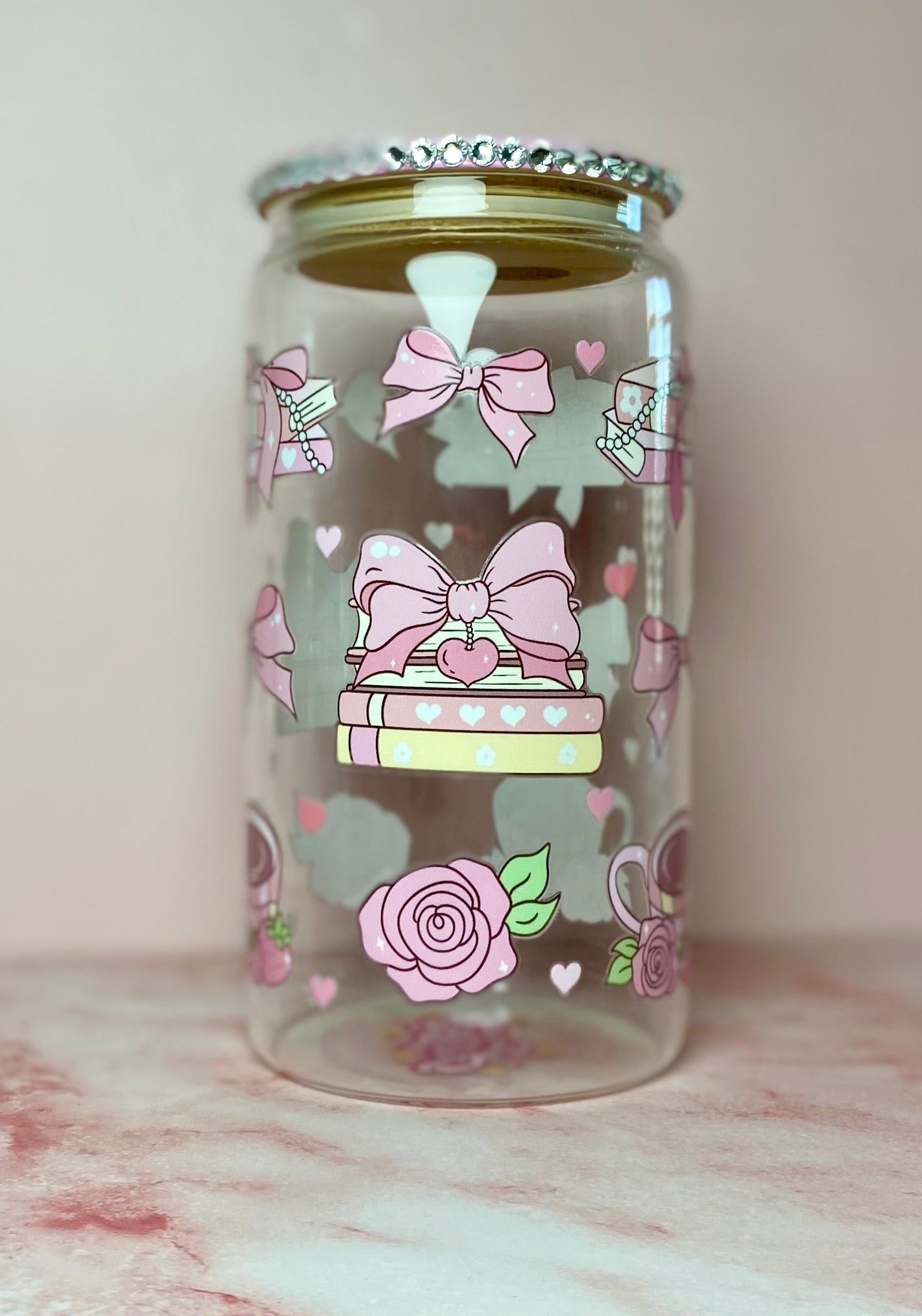 Escape into your favorite story with every sip. This glass is a dream for bibliophiles, featuring a stack of pastel books topped with a massive pink bow and a delicate rose. The bamboo lid is encrusted with brilliant clear rhinestones, making it the perfect accessory for your next reading marathon or "bookstagram" photo.