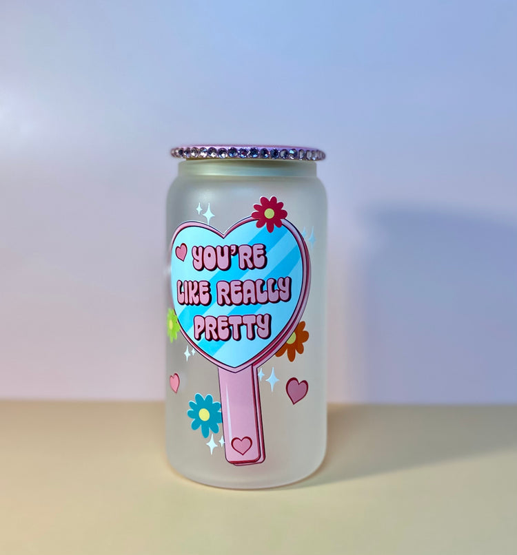 Stay hydrated and stylish with the You're Like Really Pretty Glass Cup. This 16oz glass cup is perfect for holding all your favorite drinks, while also showcasing your unique personality. Cheers to being both functional and fabulous!